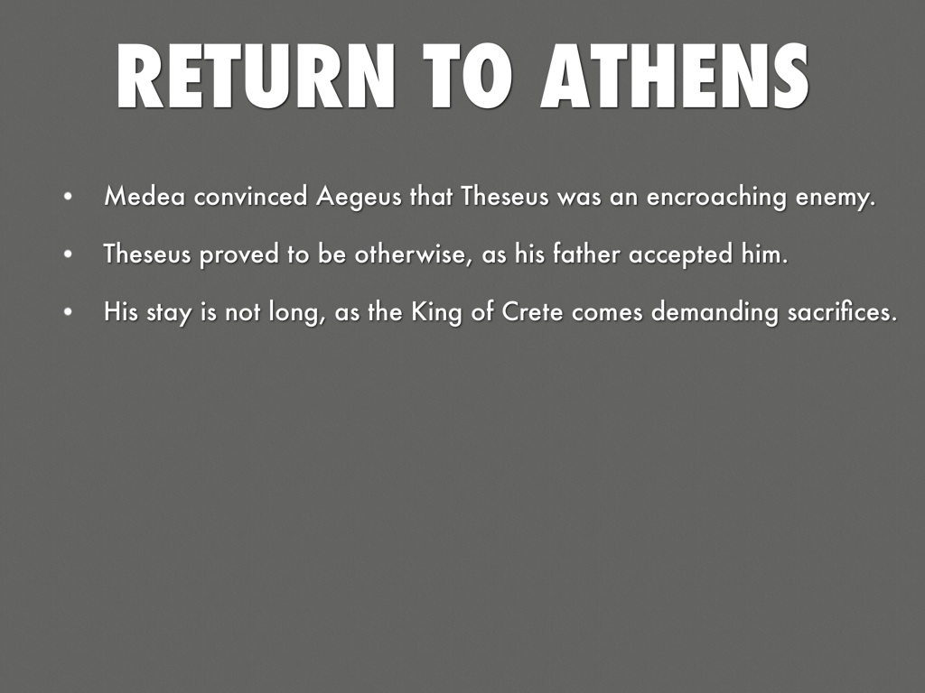 His stay is not long, as the King of Crete comes demanding sacrifices.