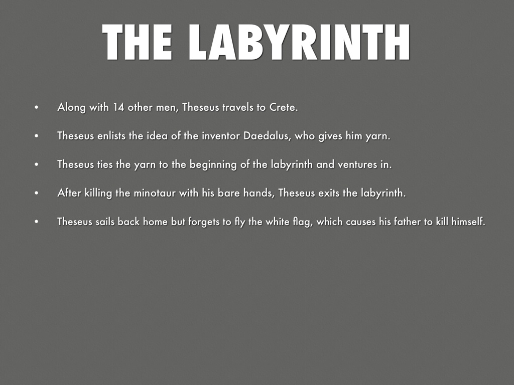 After killing the minotaur with his bare hands, Theseus exits the labyrinth.