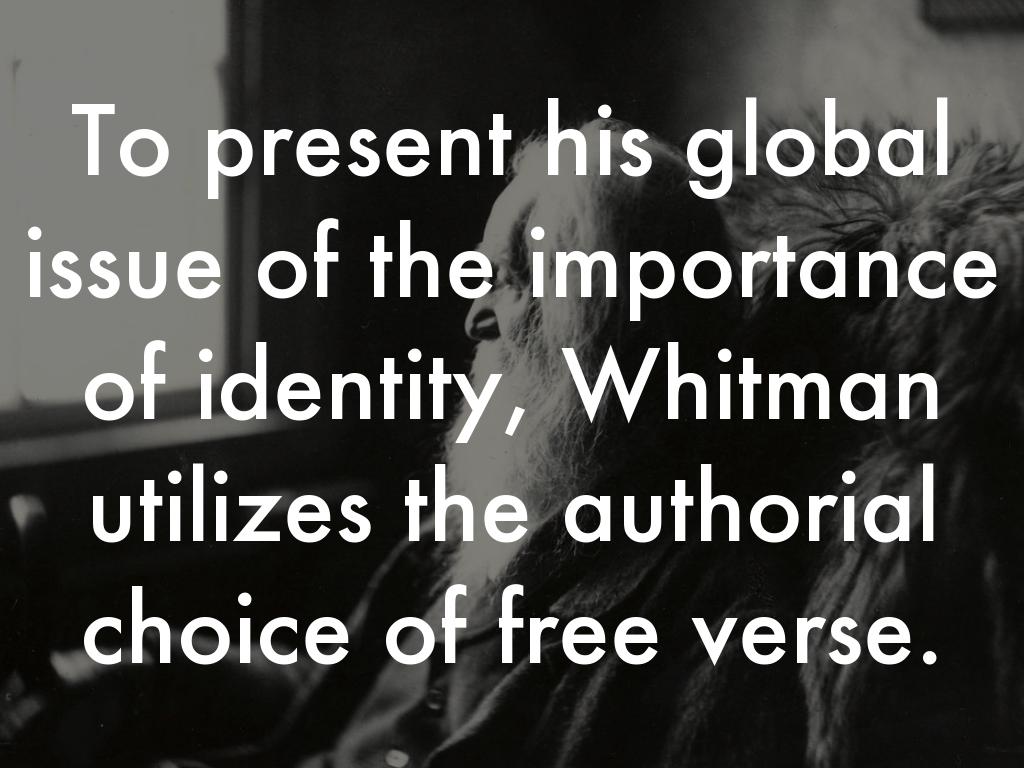 To present his global issue of the importance of identity, Whitman utilizes the authorial choice of free verse.