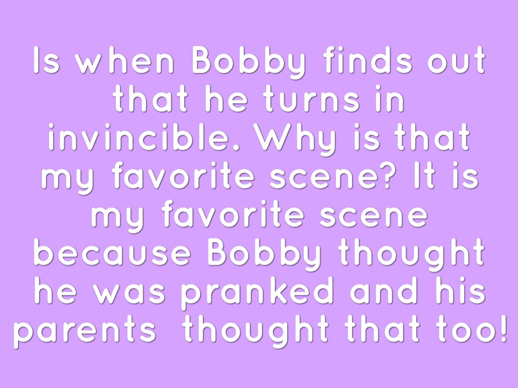 Is when Bobby finds out that he turns in invincible. Why is that my favorite scene? It is my favorite scene because Bobby thought he was pranked and his parents thought that too!