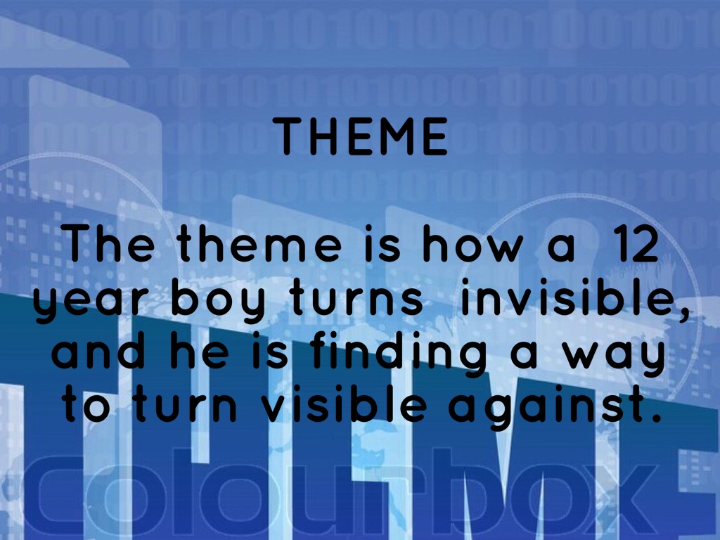 The theme is how a 12 year boy turns invisible, and he is finding a way to turn visible against.