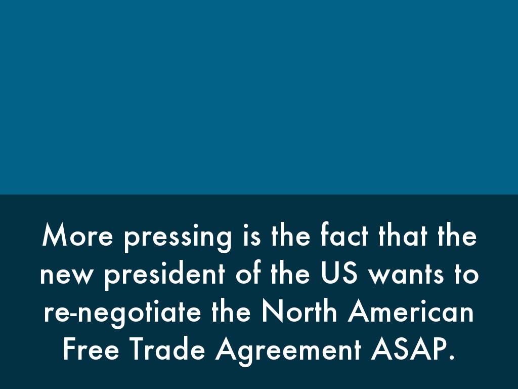 More pressing is the fact that the new president of the US wants to re-negotiate the North American Free Trade Agreement ASAP.