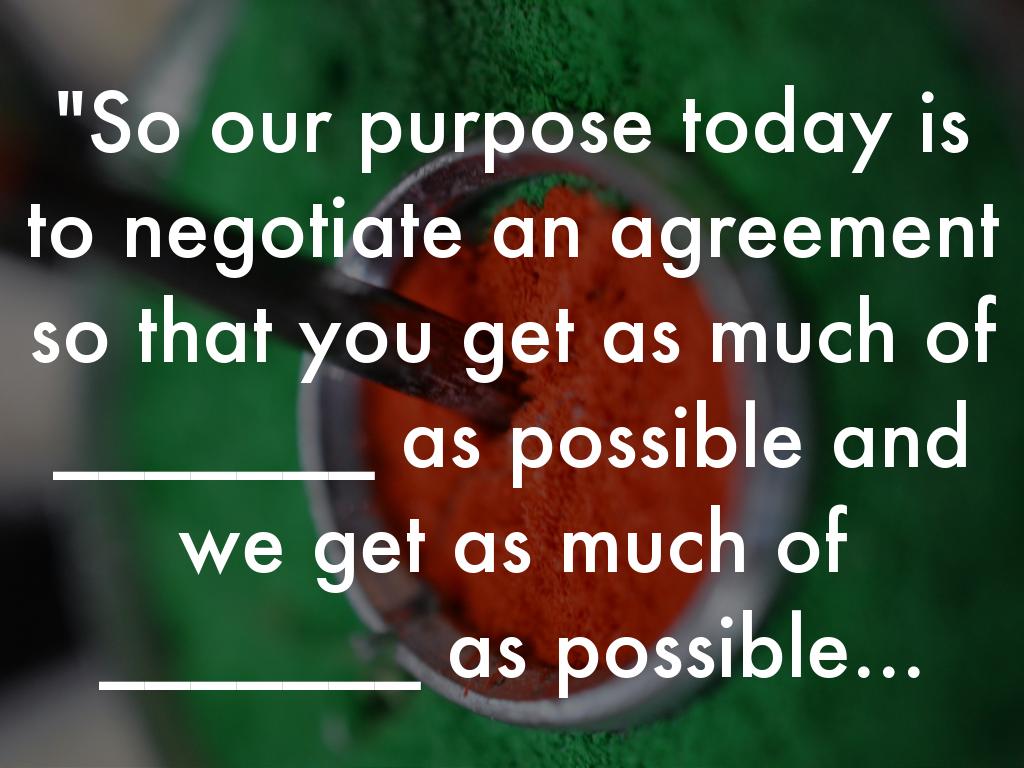 "So our purpose today is to negotiate an agreement so that you get as much of _______ as possible and we get as much of _______ as possible...