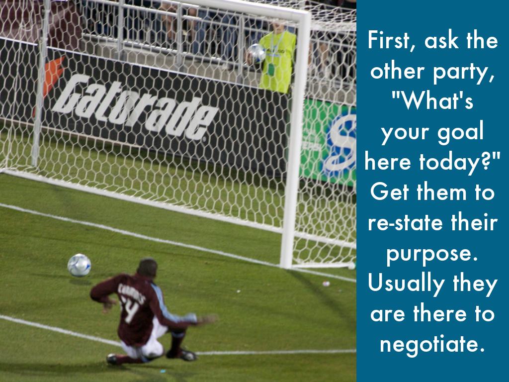First, ask the other party, "What's your goal here today?" Get them to re-state their purpose. Usually they are there to negotiate.