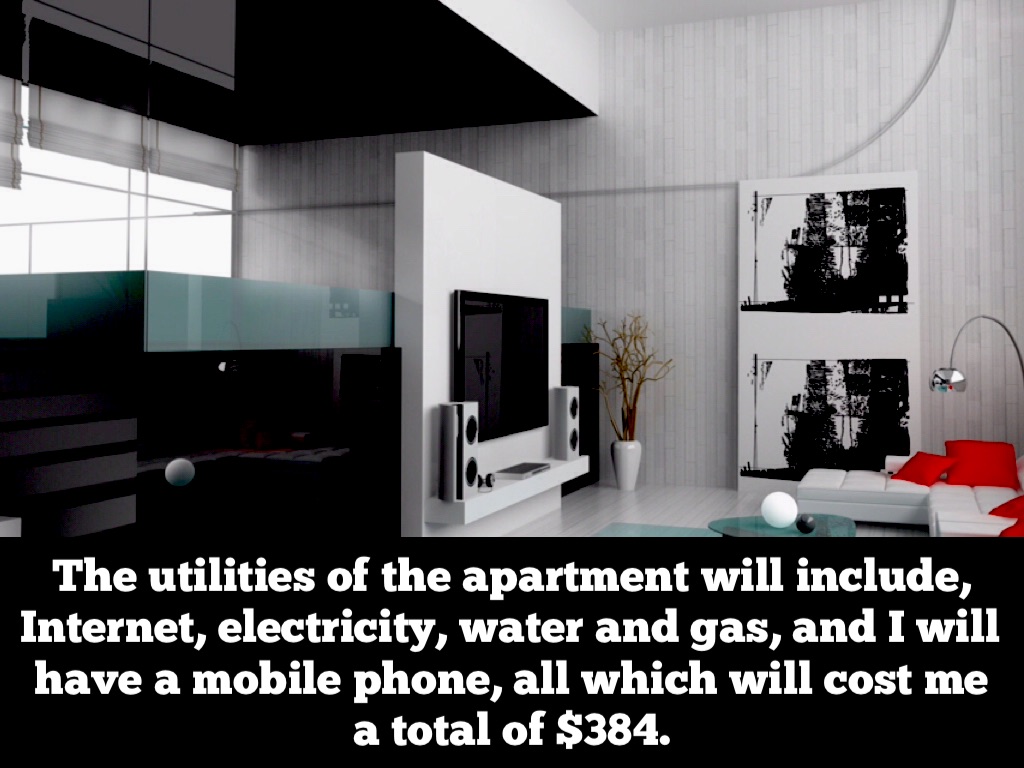 The utilities of the apartment will include, Internet, electricity, water and gas, and I will have a mobile phone, all which will cost me a total of $384.