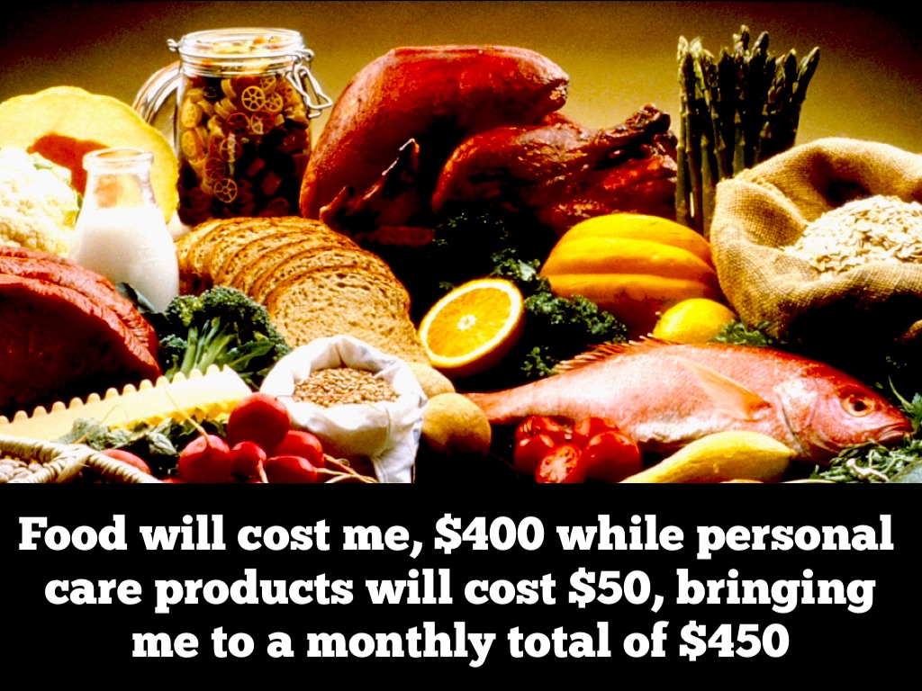 Food will cost me, $400 while personal care products will cost $50, bringing me to a monthly total of $450