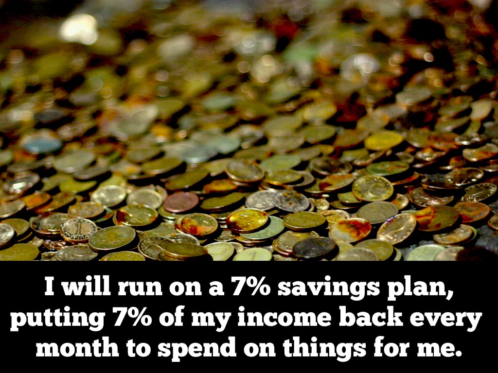 I will run on a 7% savings plan, putting 7% of my income back every month to spend on things for me.