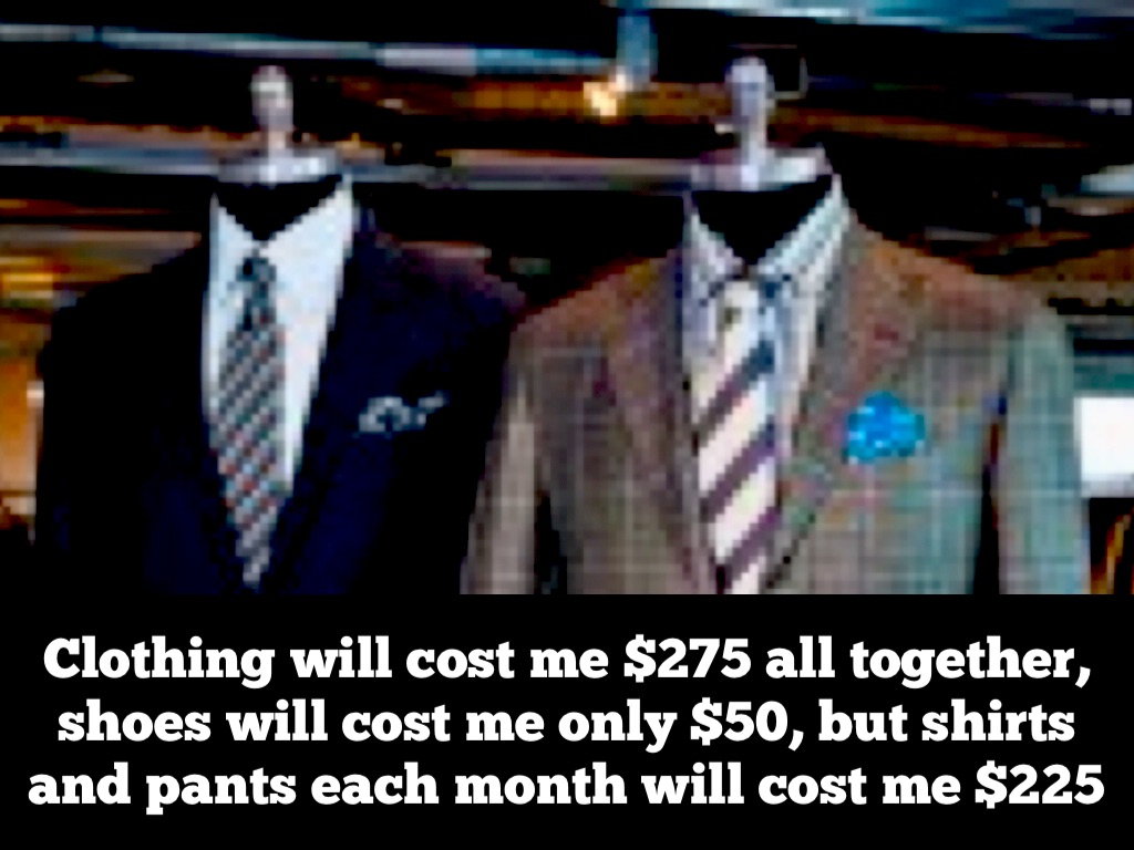 Clothing will cost me $275 all together, shoes will cost me only $50, but shirts and pants each month will cost me $225