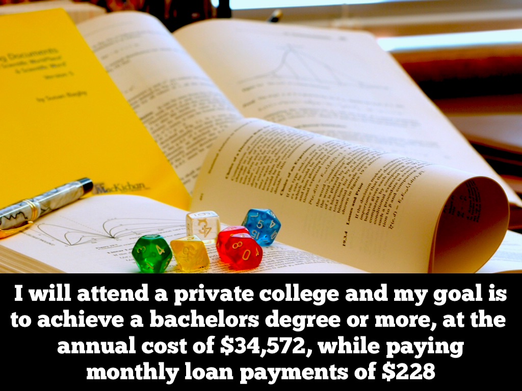 I will attend a private college and my goal is to achieve a bachelors degree or more, at the annual cost of $34,572, while paying monthly loan payments of $228