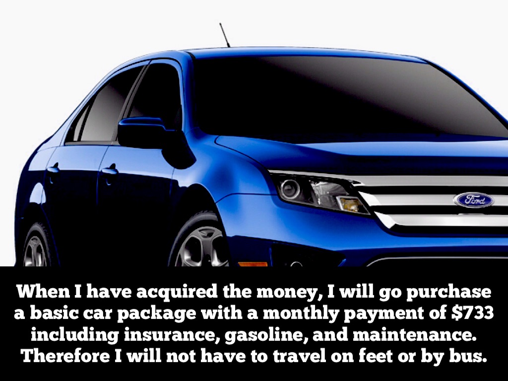 When I have acquired the money, I will go purchase a basic car package with a monthly payment of $733 including insurance, gasoline, and maintenance. Therefore I will not have to travel on feet or by bus.