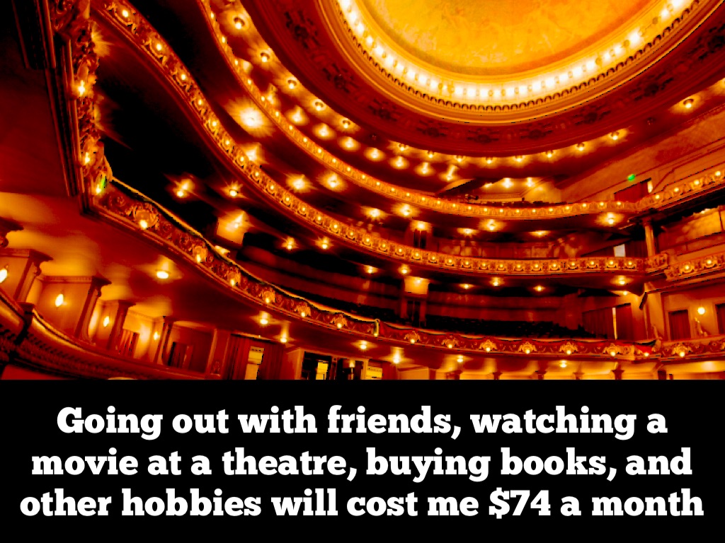 Going out with friends, watching a movie at a theatre, buying books, and other hobbies will cost me $74 a month