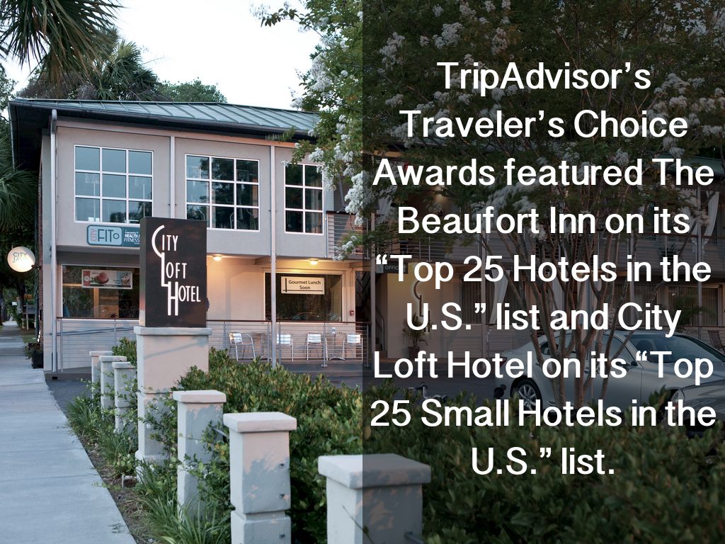 TripAdvisor’s Traveler’s Choice Awards featured The Beaufort Inn on its “Top 25 Hotels in the U.S.” list and City Loft Hotel on its “Top 25 Small Hotels in the U.S.” list.