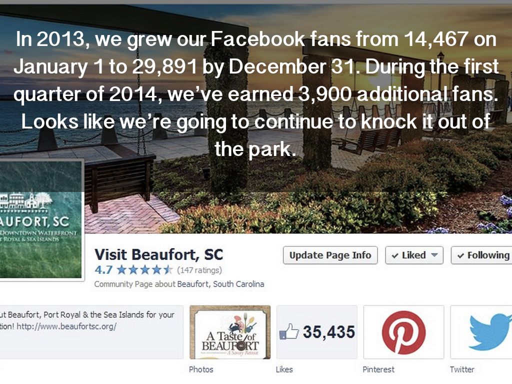 In 2013, we grew our Facebook fans from 14,467 on January 1 to 29,891 by December 31. During the first quarter of 2014, we’ve earned 3,900 additional fans. Looks like we’re going to continue to knock it out of the park.