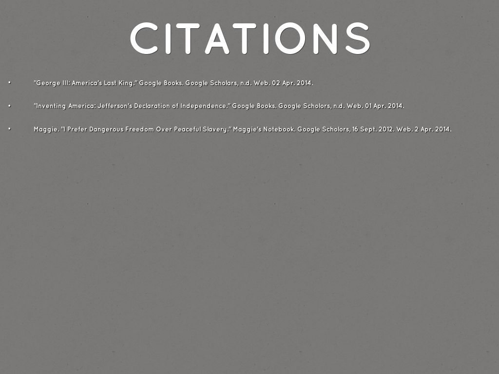 - Maggie. "I Prefer Dangerous Freedom Over Peaceful Slavery." Maggie's Notebook. Google Scholors, 16 Sept. 2012. Web. 2 Apr. 2014.