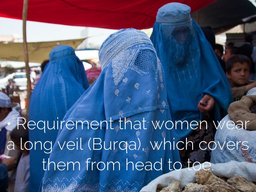 • Requirement that women wear a long veil (Burqa), which covers them from head to toe.