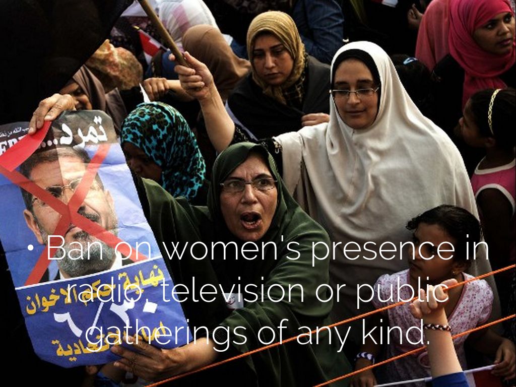 • Ban on women's presence in radio, television or public gatherings of any kind.