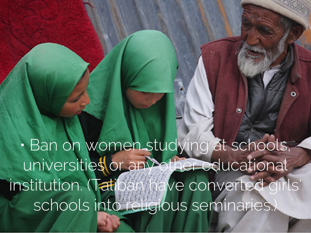 • Ban on women studying at schools, universities or any other educational institution. (Taliban have converted girls' schools into religious seminaries.)