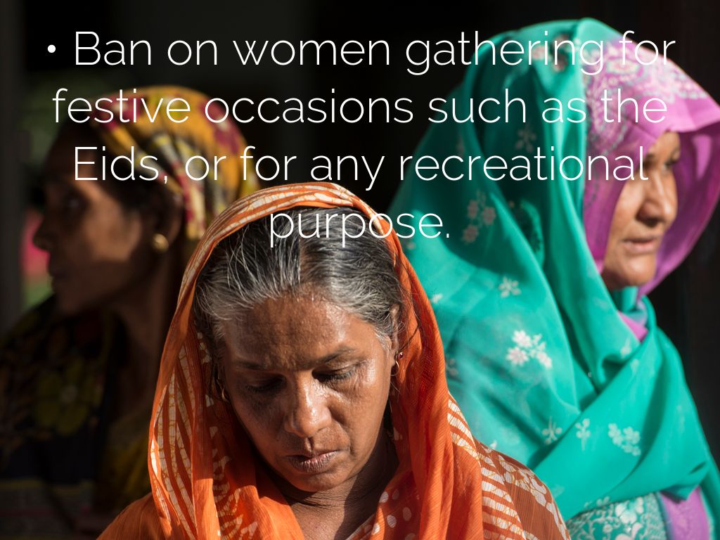 • Ban on women gathering for festive occasions such as the Eids, or for any recreational purpose.