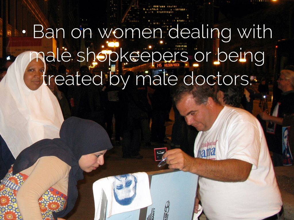 • Ban on women dealing with male shopkeepers or being treated by male doctors.
