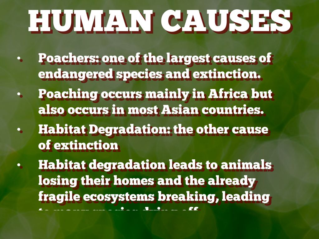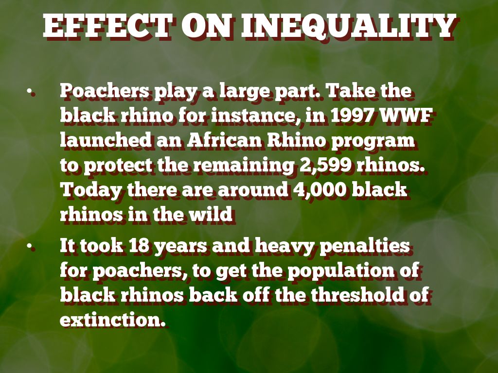 Poachers play a large part. Take the black rhino for instance, in 1997 WWF launched an African Rhino program to protect the remaining 2,599 rhinos. Today there are around 4,000 black rhinos in the wild