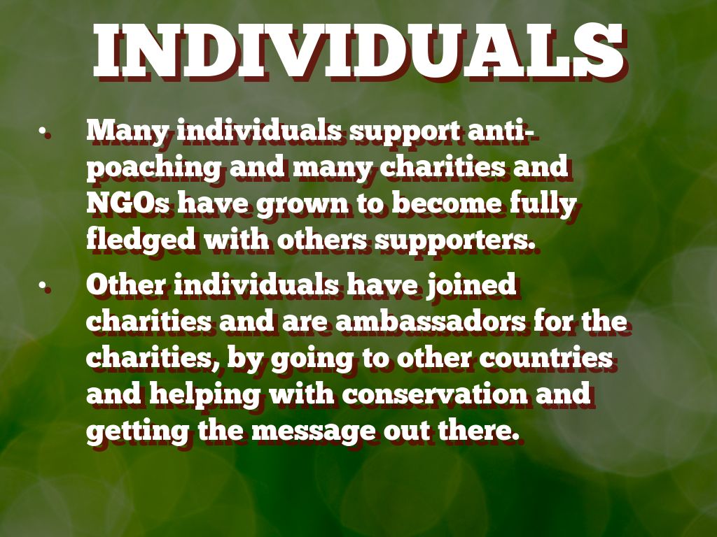 Many individuals support anti-poaching and many charities and NGOs have grown to become fully fledged with others supporters.