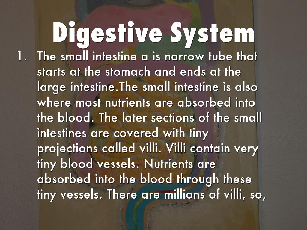 The small intestine a is narrow tube that starts at the stomach and ends at the large intestine.The small intestine is also where most nutrients are absorbed into the blood. The later sections of the small intestines are covered with tiny projections called villi. Villi contain very tiny blood vessels. Nutrients are absorbed into the blood through these tiny vessels. There are millions of villi, so, altogether, there is a very large area for absorption to take place.