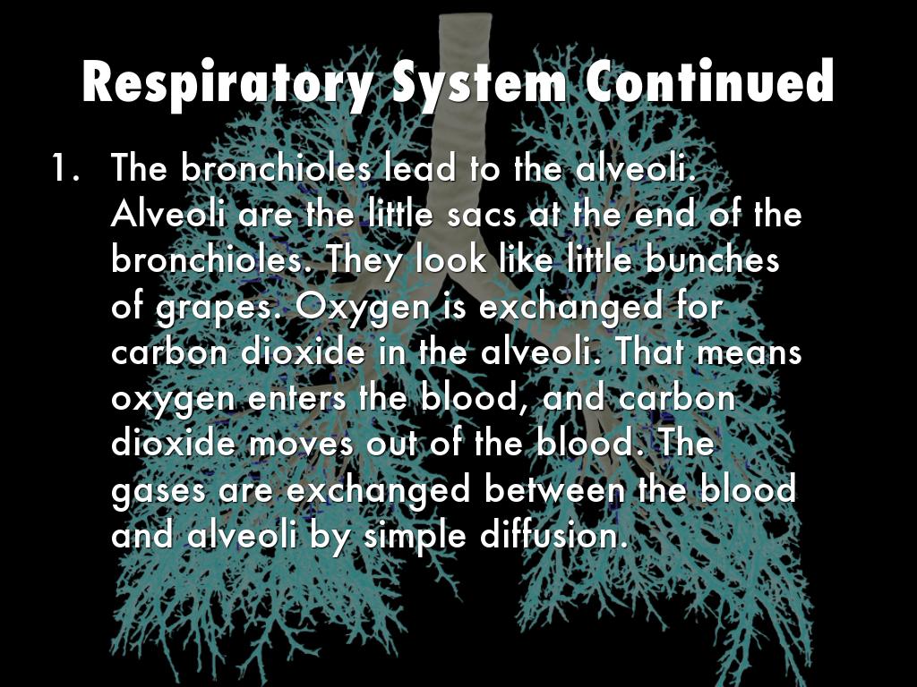 The bronchioles lead to the alveoli. Alveoli are the little sacs at the end of the bronchioles. They look like little bunches of grapes. Oxygen is exchanged for carbon dioxide in the alveoli. That means oxygen enters the blood, and carbon dioxide moves out of the blood. The gases are exchanged between the blood and alveoli by simple diffusion.