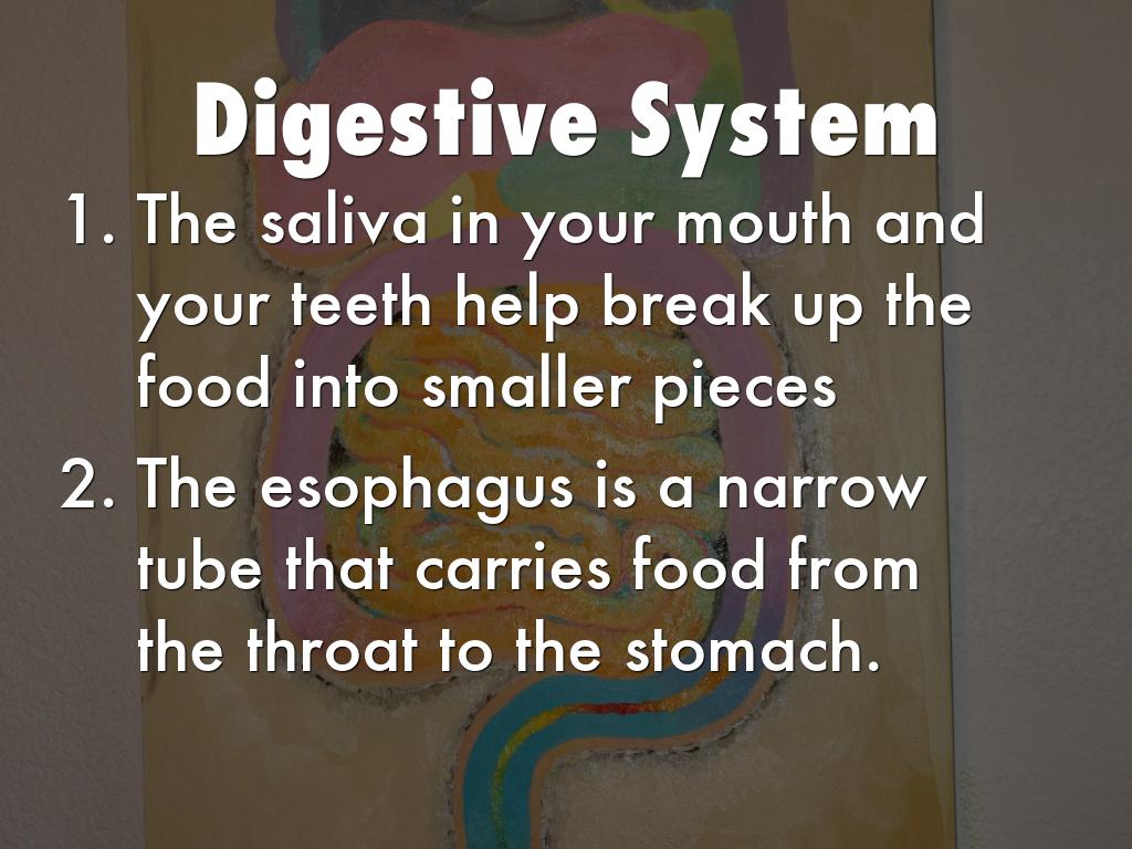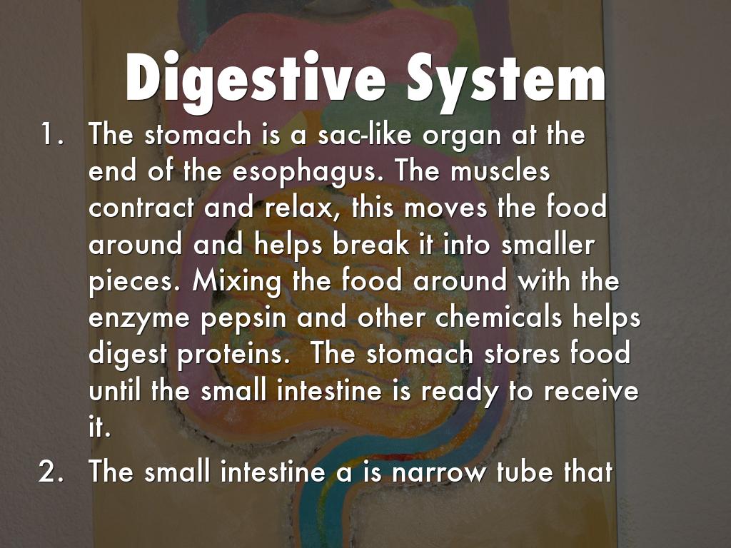 The stomach is a sac-like organ at the end of the esophagus. The muscles contract and relax, this moves the food around and helps break it into smaller pieces. Mixing the food around with the enzyme pepsin and other chemicals helps digest proteins. The stomach stores food until the small intestine is ready to receive it.