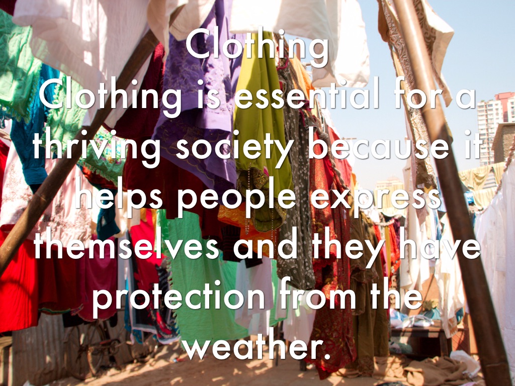 Clothing is essential for a thriving society because it helps people express themselves and they have protection from the weather.