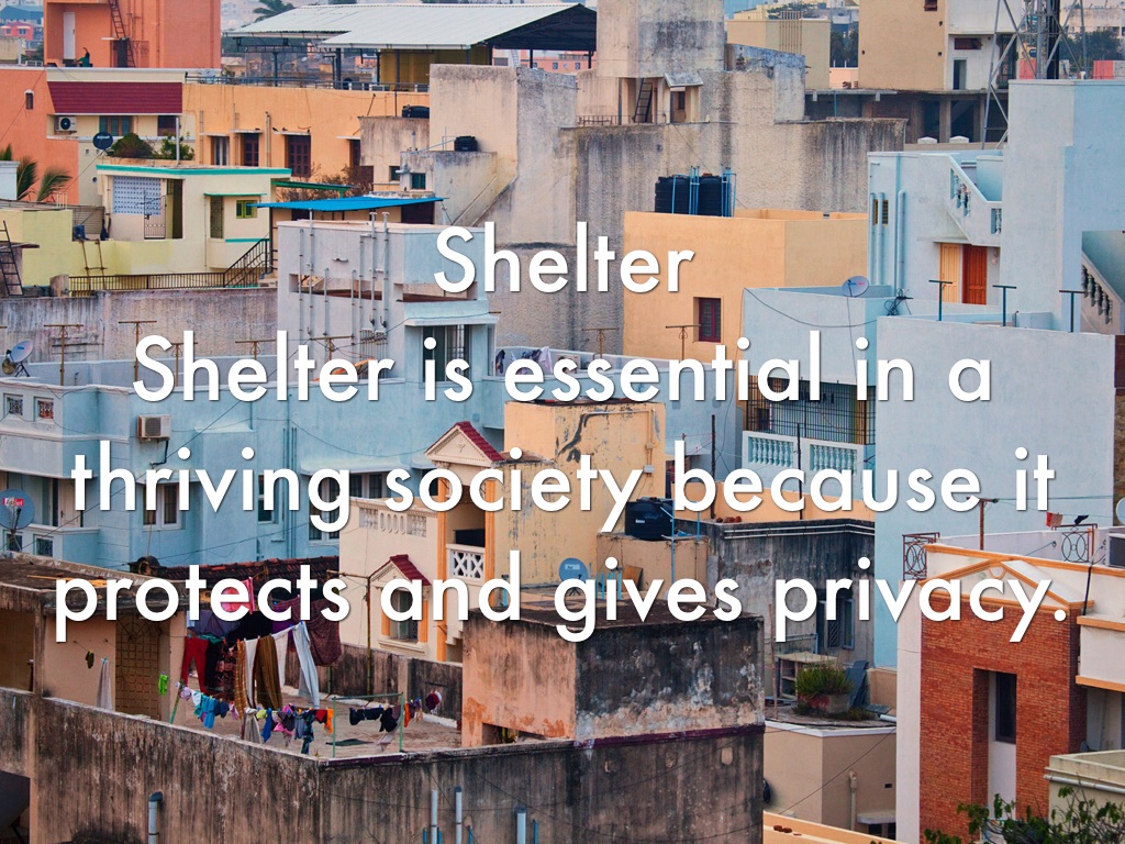 Shelter is essential in a thriving society because it protects and gives privacy.