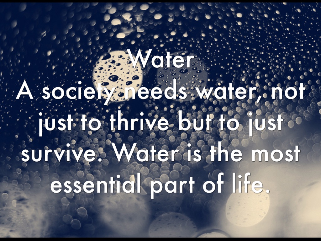 A society needs water, not just to thrive but to just survive. Water is the most essential part of life.