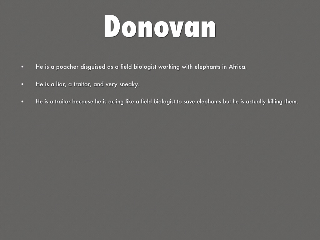 • He is a poacher disguised as a field biologist working with elephants in Africa.