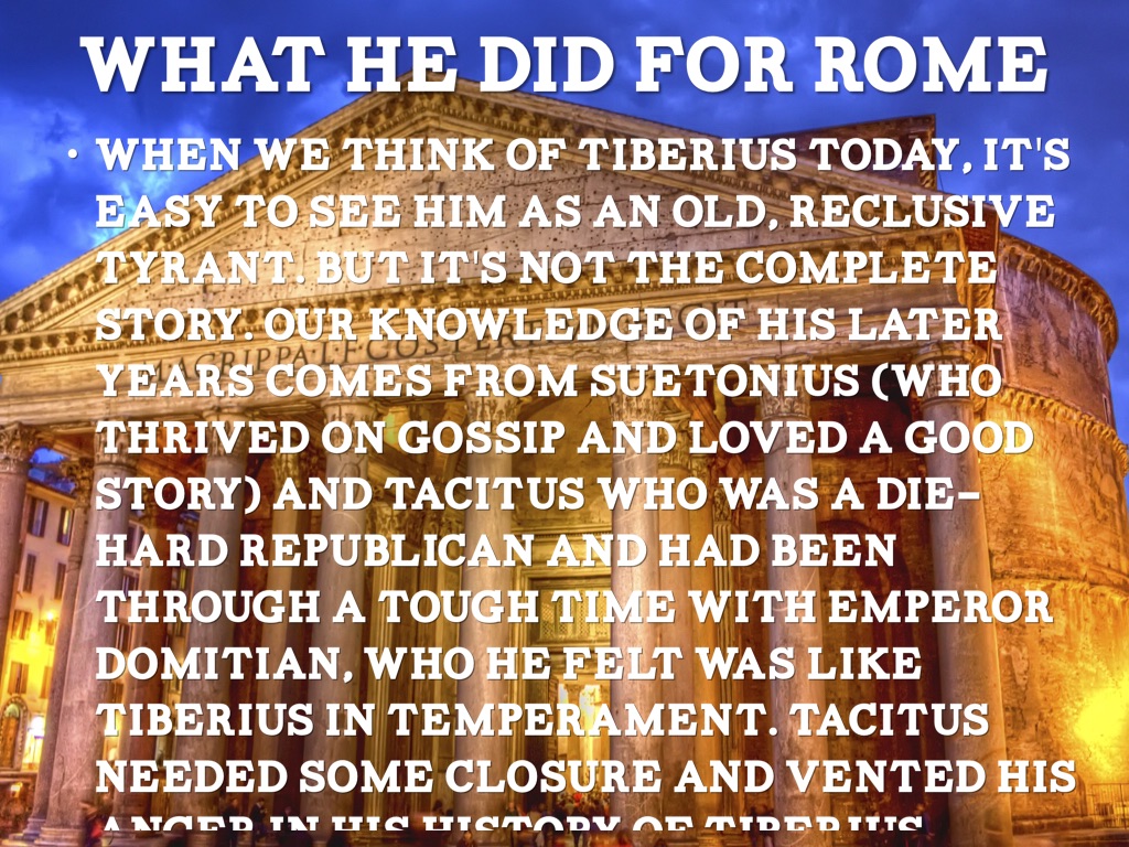 • When we think of Tiberius today, it's easy to see him as an old, reclusive tyrant. But it's not the complete story. Our knowledge of his later years comes from Suetonius (who thrived on gossip and loved a good story) and Tacitus who was a die-hard Republican and had been through a tough time with emperor Domitian, who he felt was like Tiberius in temperament. Tacitus needed some closure and vented his anger in his history of Tiberius. The good If you dig into the background of Tiberius, what you see is an enigmatic personality: shy, a bit awkward in public places, happier with a close circle of friends and with no time for intrigue and politics. Tiberius was in his day one of Rome's greatest generals. His soldiers were very fond of him and as well as respecting his capability, liked the fact that he endured the same hardships as they did. On campaigns, he would sleep in the open on the bare ground with a blanket thrown over him. He made it clear to his officers that they were to come to him if they had any concerns or questions about his orders and he issued orders in writing so there was no confusion. The warmth his soldiers felt for him is shown in the nickname they gave him: Biberius Caldius Mero (drinker of hot wine), a pun on his name Tiberius Claudius Nero. Before he became emperor, he was Augustus' fixer, campaigning on the Rhine, then far into Germany. In AD6 he was planning to conquer Bohemia and Moravia when he was called to suppress a serious Balkan revolt. After this job was done, in AD9 he had to clear up the mess left by Quinctilius Varus in the Teutoburg Forest, where three of Rome's best legions were annihilated by the Germans. At the time, this was so serious that there were fears the empire could topple. Tiberius was a war winner and was happiest with his soldiers on campaign. The not so good When he became emperor, and therefore Rome's foremost celebrity, his personality couldn't really cope. He came across as aloof, arrogant, lacking the diplomacy of Augustus and with no time for social gatherings or games. He began to surround himself with writers, mystics and astrologers and in escaping reality this way, was glad to hand over the day to day issues to someone else, as it turned out, Sejanus. While Tiberius was debating obscure literary and mythological issues in his retreat on the island of Capri, Sejanus was engaging in murder and intrigue with an eye on the imperial purple himself. Romans were a very social society and could not understand Tiberius' withdrawal from public life. It gave rise to many rumors about what was going on in his Capri palace; we will never know the truth of these, but the fact that they were spread around highlights his unpopularity. Eventually his reign descended into terror. After Sejanus was found out and removed, Tiberius' fears and suspicions led to a surge in treason trials, with many undoubtedly innocent people executed.