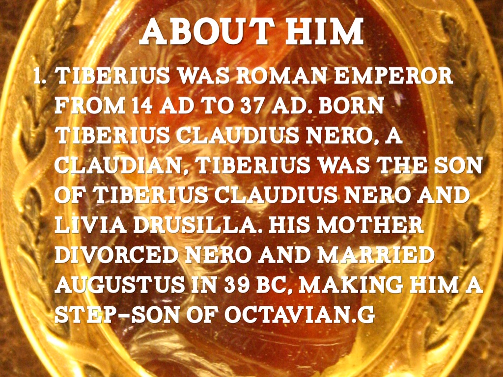 • Tiberius was Roman Emperor from 14 AD to 37 AD. Born Tiberius Claudius Nero, a Claudian, Tiberius was the son of Tiberius Claudius Nero and Livia Drusilla. His mother divorced Nero and married Augustus in 39 BC, making him a step-son of Octavian.g