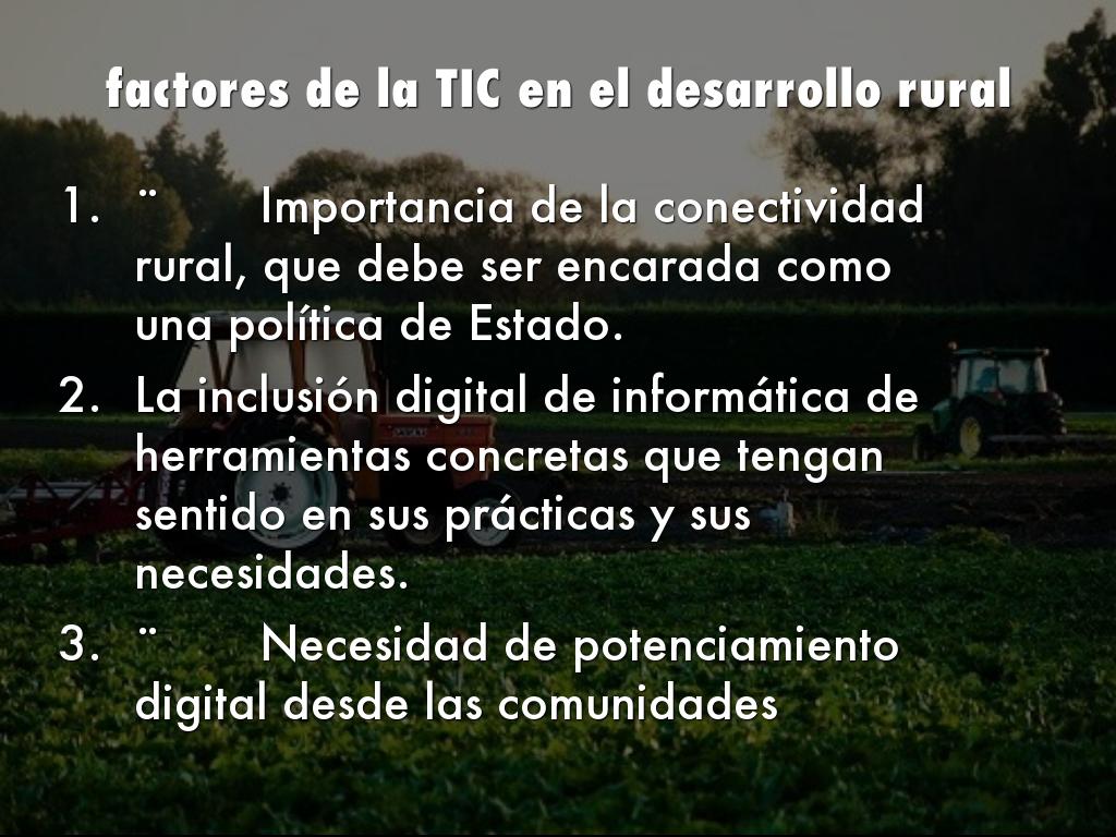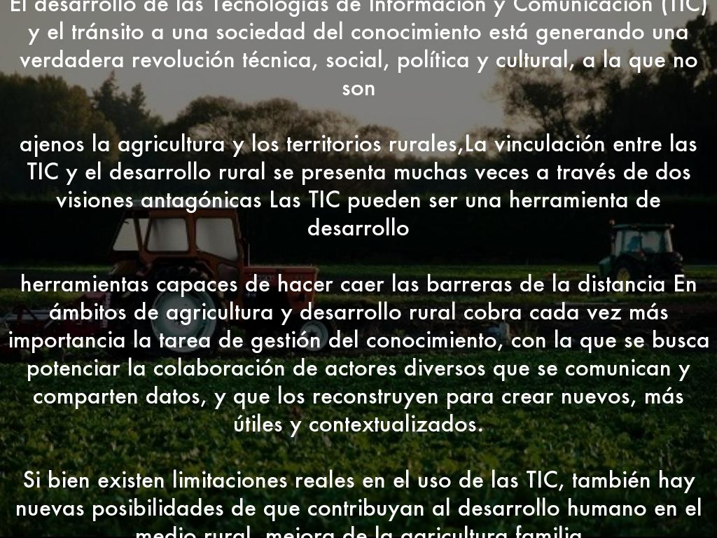 Si bien existen limitaciones reales en el uso de las TIC, también hay nuevas posibilidades de que contribuyan al desarrollo humano en el medio rural, mejora de la agricultura familia