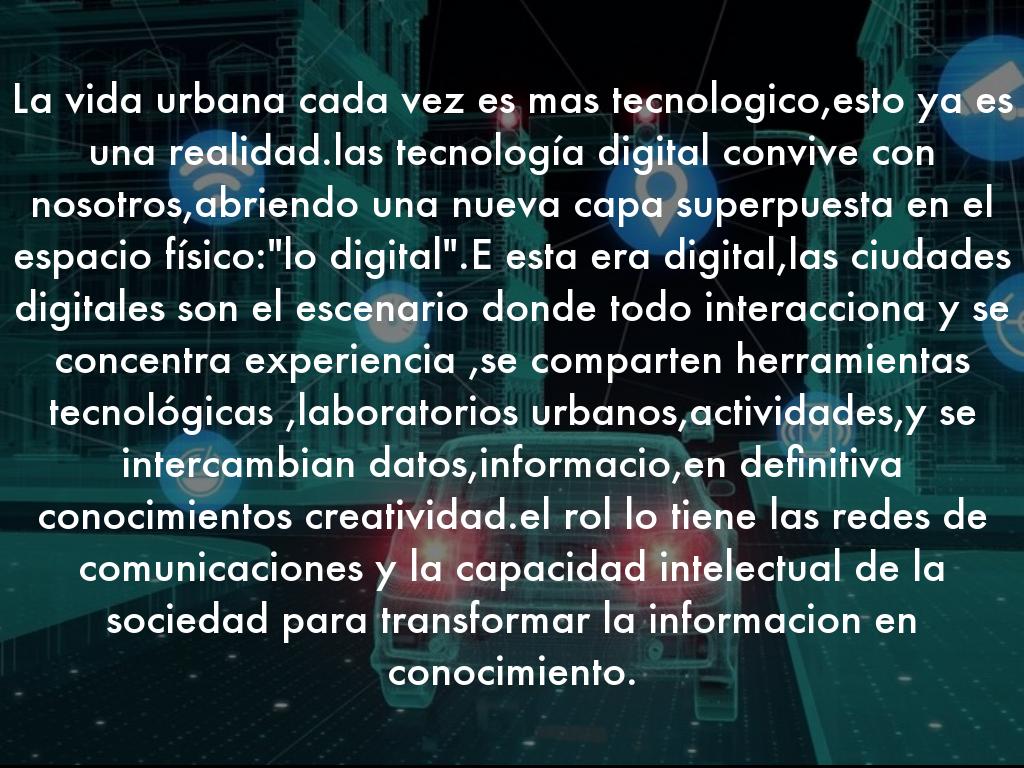 La vida urbana cada vez es mas tecnologico,esto ya es una realidad.las tecnología digital convive con nosotros,abriendo una nueva capa superpuesta en el espacio físico:"lo digital".E esta era digital,las ciudades digitales son el escenario donde todo interacciona y se concentra experiencia ,se comparten herramientas tecnológicas ,laboratorios urbanos,actividades,y se intercambian datos,informacio,en definitiva conocimientos creatividad.el rol lo tiene las redes de comunicaciones y la capacidad intelectual de la sociedad para transformar la informacion en conocimiento.