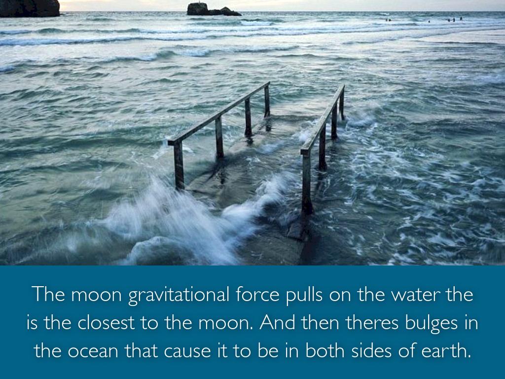 The moon gravitational force pulls on the water the is the closest to the moon. And then theres bulges in the ocean that cause it to be in both sides of earth.