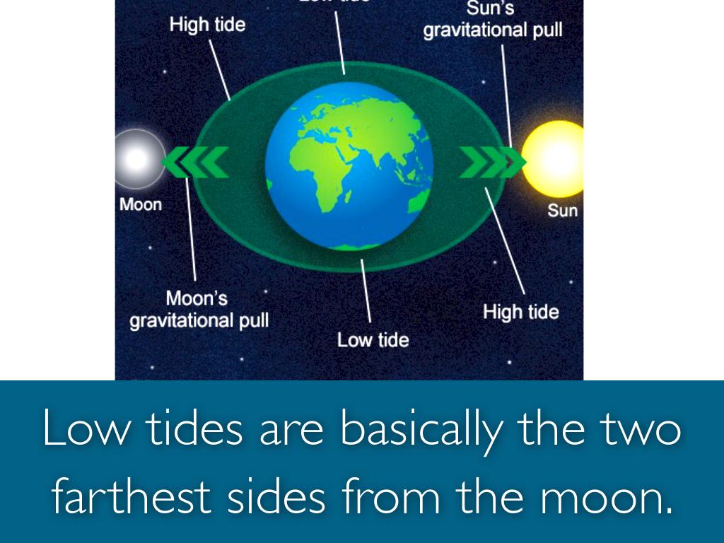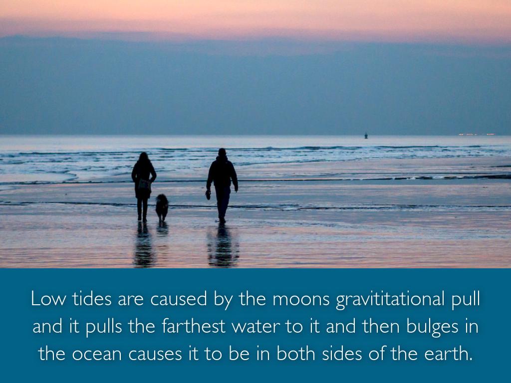 Low tides are caused by the moons gravititational pull and it pulls the farthest water to it and then bulges in the ocean causes it to be in both sides of the earth.