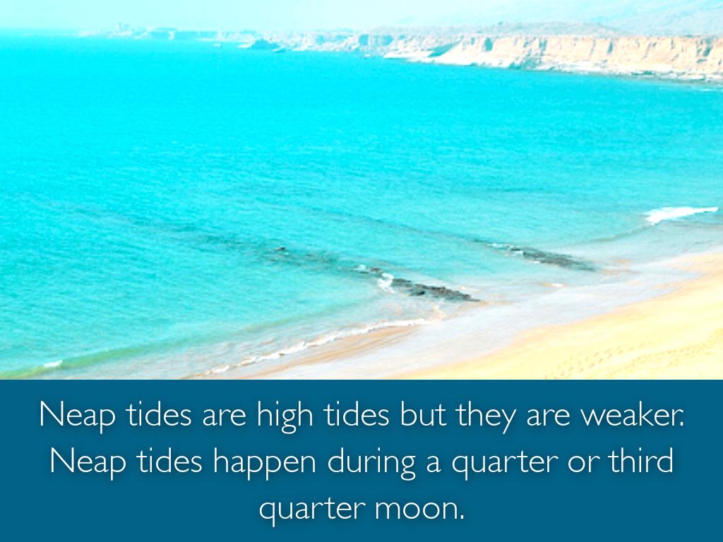 Neap tides are high tides but they are weaker. Neap tides happen during a quarter or third quarter moon.