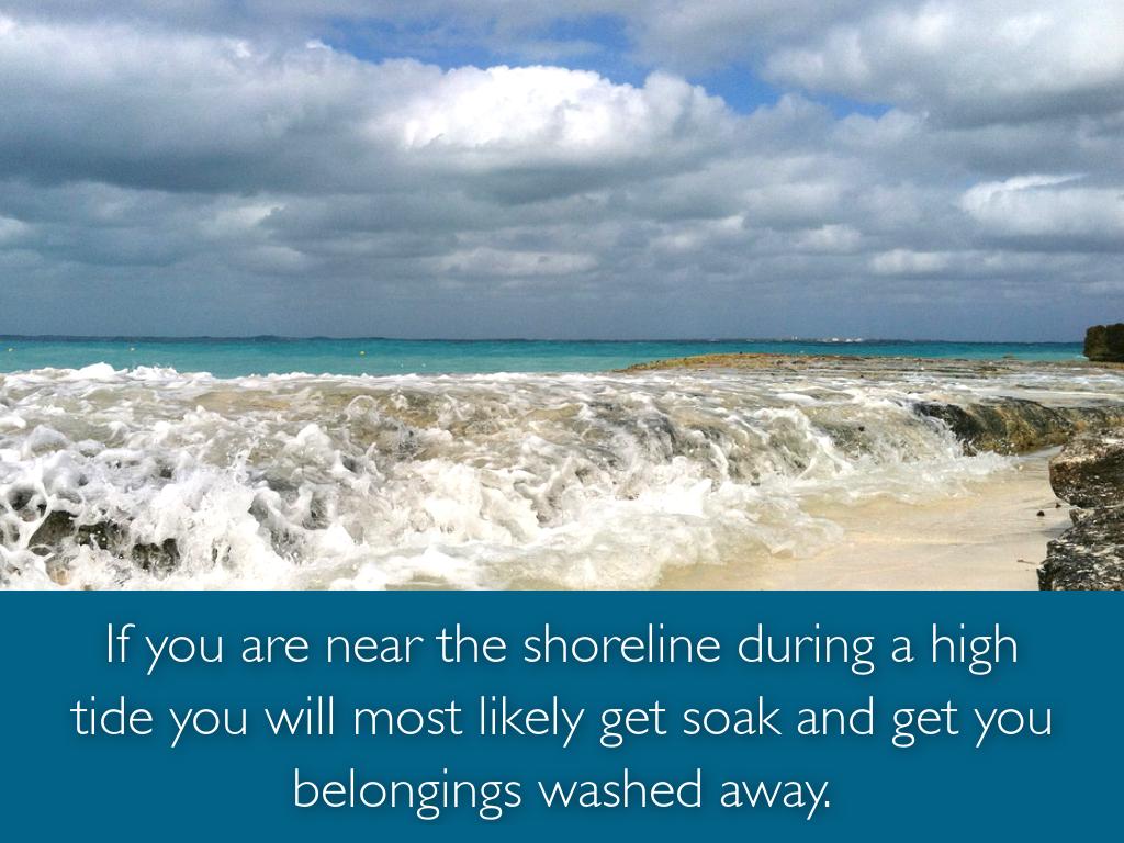 If you are near the shoreline during a high tide you will most likely get soak and get you belongings washed away.