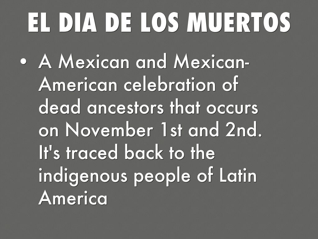 A Mexican and Mexican-American celebration of dead ancestors that occurs on November 1st and 2nd. It's traced back to the indigenous people of Latin America