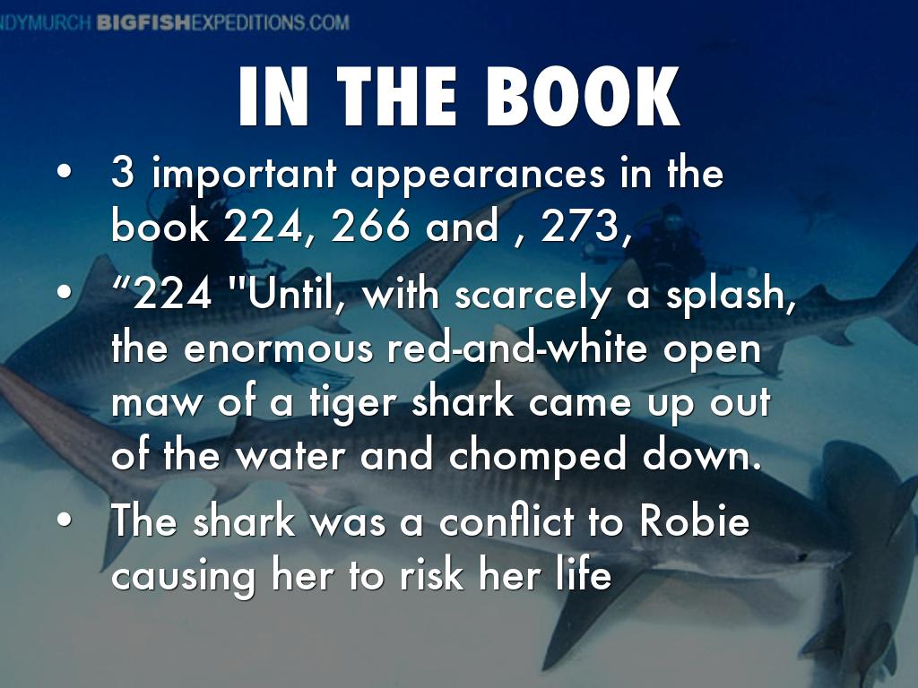 “224 ''Until, with scarcely a splash, the enormous red-and-white open maw of a tiger shark came up out of the water and chomped down.