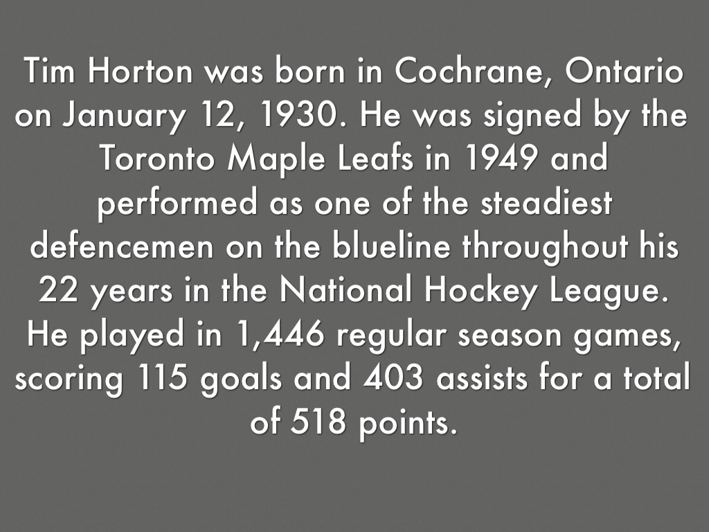Tim Horton was born in Cochrane, Ontario on January 12, 1930. He was signed by the Toronto Maple Leafs in 1949 and performed as one of the steadiest defencemen on the blueline throughout his 22 years in the National Hockey League. He played in 1,446 regular season games, scoring 115 goals and 403 assists for a total of 518 points.