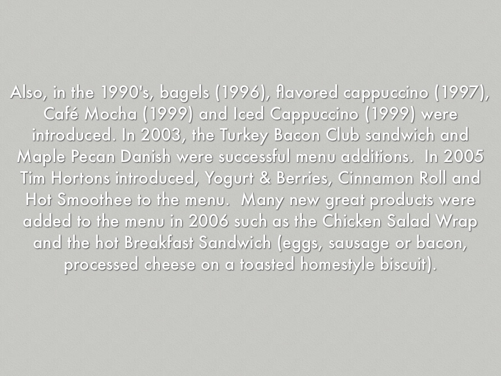 Also, in the 1990's, bagels (1996), flavored cappuccino (1997), Café Mocha (1999) and Iced Cappuccino (1999) were introduced. In 2003, the Turkey Bacon Club sandwich and Maple Pecan Danish were successful menu additions. In 2005 Tim Hortons introduced, Yogurt & Berries, Cinnamon Roll and Hot Smoothee to the menu. Many new great products were added to the menu in 2006 such as the Chicken Salad Wrap and the hot Breakfast Sandwich (eggs, sausage or bacon, processed cheese on a toasted homestyle biscuit).