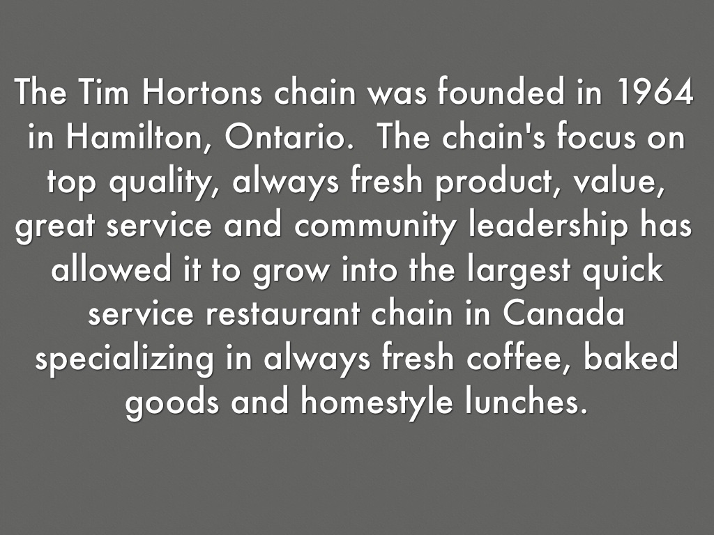 The Tim Hortons chain was founded in 1964 in Hamilton, Ontario. The chain's focus on top quality, always fresh product, value, great service and community leadership has allowed it to grow into the largest quick service restaurant chain in Canada specializing in always fresh coffee, baked goods and homestyle lunches.