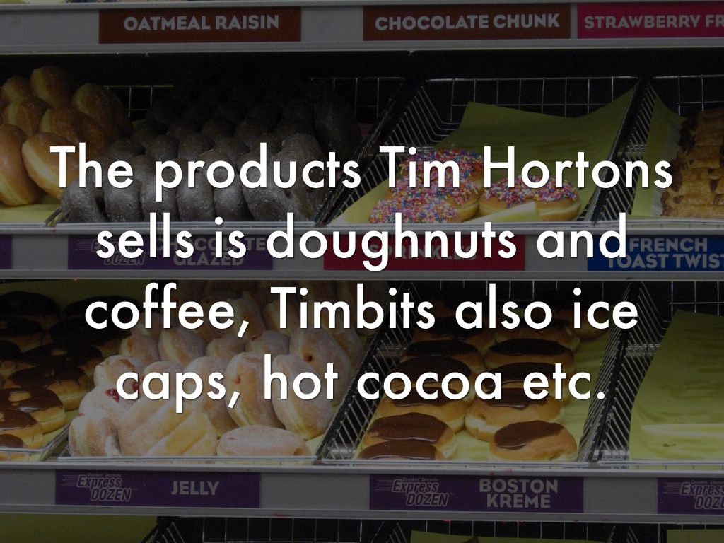 The products Tim Hortons sells is doughnuts and coffee, Timbits also ice caps, hot cocoa etc.