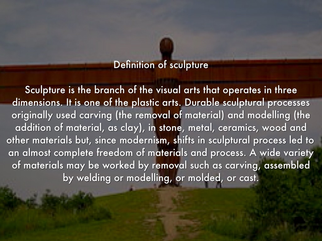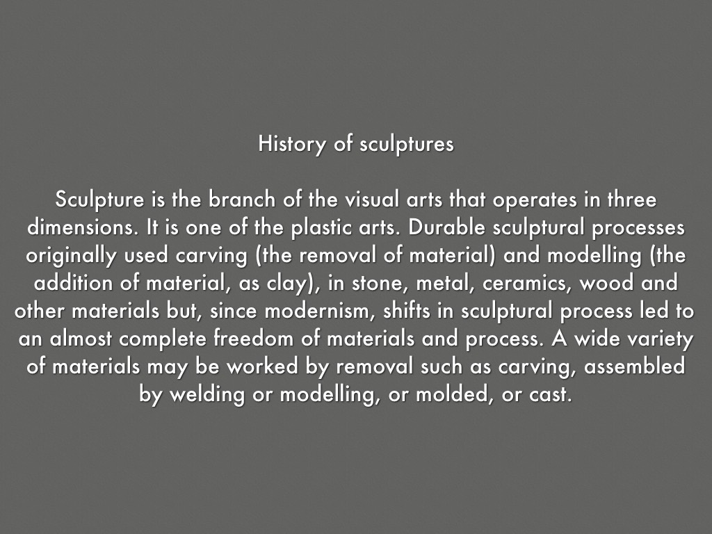 Sculpture is the branch of the visual arts that operates in three dimensions. It is one of the plastic arts. Durable sculptural processes originally used carving (the removal of material) and modelling (the addition of material, as clay), in stone, metal, ceramics, wood and other materials but, since modernism, shifts in sculptural process led to an almost complete freedom of materials and process. A wide variety of materials may be worked by removal such as carving, assembled by welding or modelling, or molded, or cast.