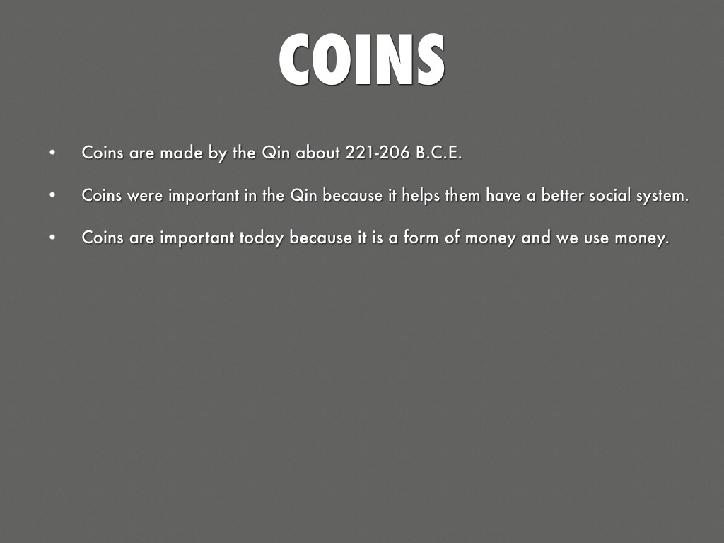 The Qin ruled from 221 to 206 B.C. and invented coins and the Great Wall of China.