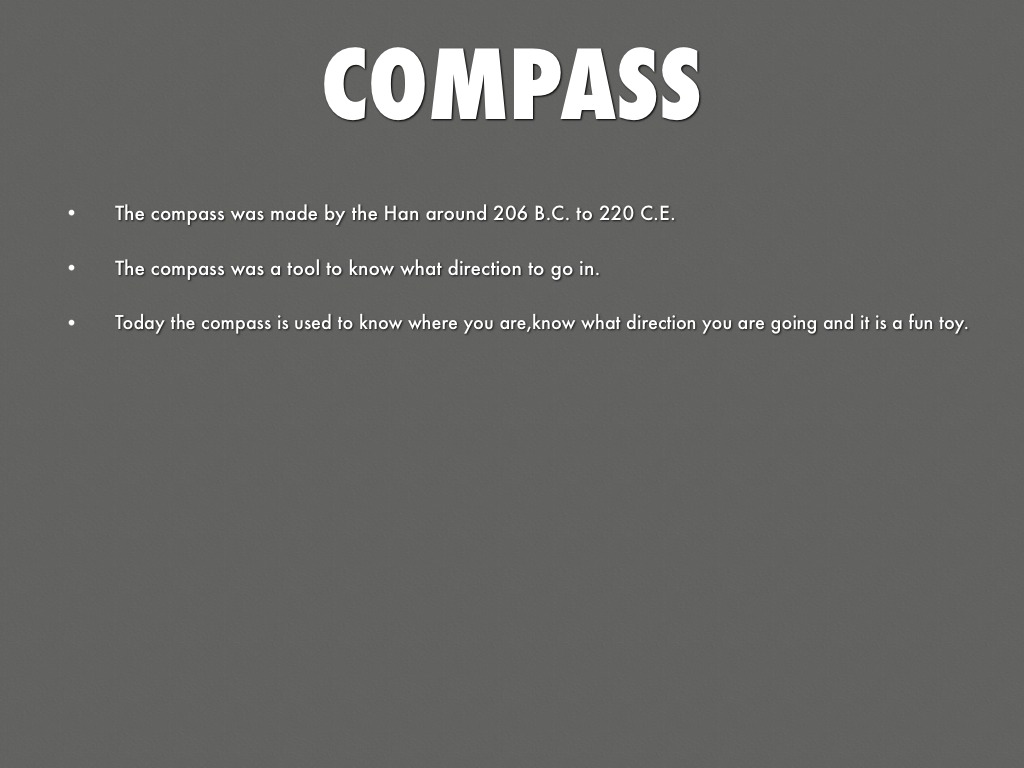 Today the compass is used to know where you are,know what direction you are going and it is a fun toy.