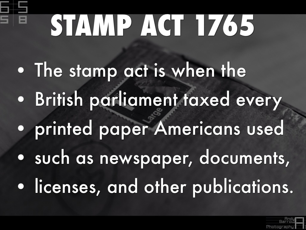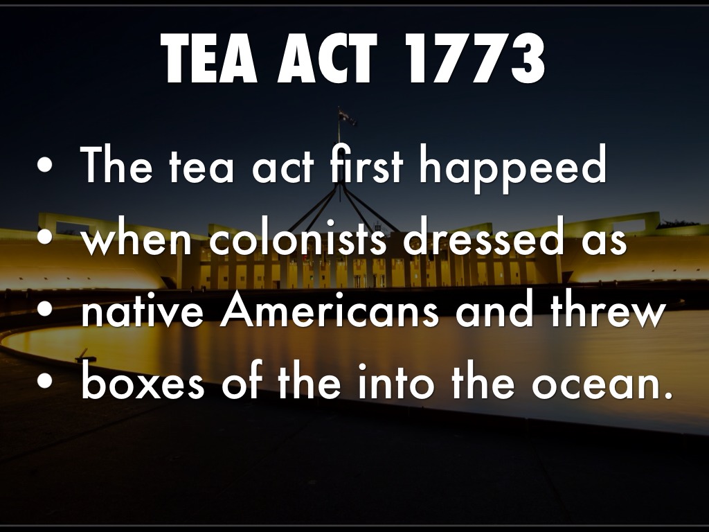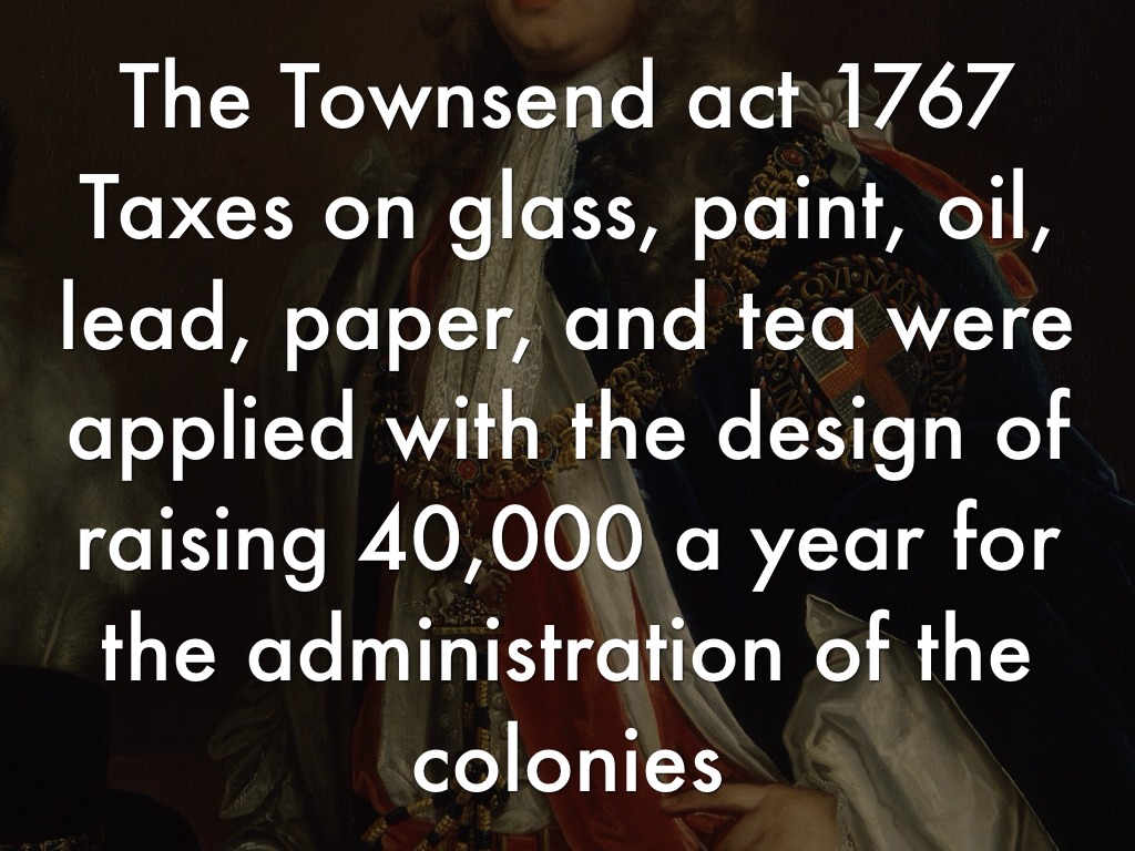 The Townsend act 1767 Taxes on glass, paint, oil, lead, paper, and tea were applied with the design of raising 40,000 a year for the administration of the colonies